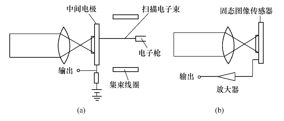 而圖(b)所示的固態(tài)圖像傳感器的輸出信號的產(chǎn)生,不需外加掃描電子束,它可以直接由自掃描半導(dǎo)體襯底上諸像素而獲得。輸出電信號與像素的位置對應(yīng),因而,再生圖像失真度極小。顯然,光導(dǎo)攝像管等圖像傳感器,由于掃描電子束偏轉(zhuǎn)畸變或聚焦變化等原因所引起的再生圖像的失真,往往是很難避免的。圖 攝像管與固態(tài)圖像傳感器原理比較(a)光導(dǎo)攝像管;(b)固態(tài)圖像傳感器。